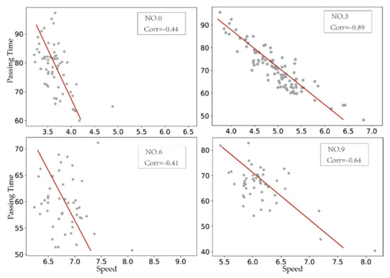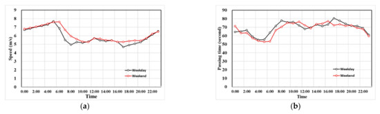 For the passing time variable group, the passing time is the most intuitive parameter representing the intersections’ operation performance [9]. Noted that the historical passing intersection time reveals the normal propagation rule and verifies the real-time passing time pattern. Therefore, this section adopts the historical and real-time pattern of passing intersection time as the input matrix. We extracted the passing time from the floating car data (see Figure 9).