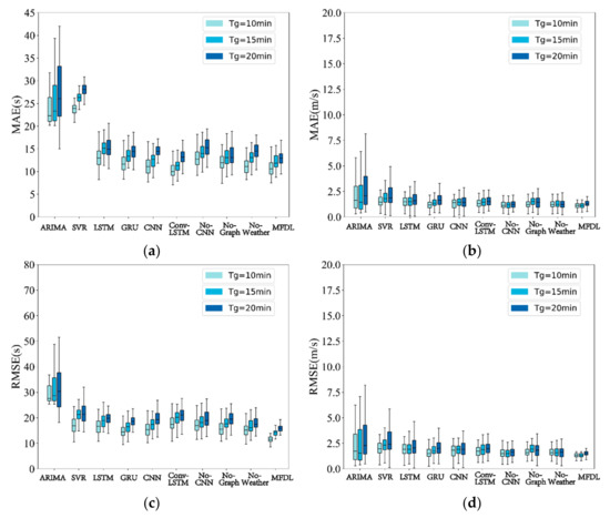 Figure 14 shows the overall prediction errors produced by the different methods on different time granularities (i.e., Tg = 10, 15 and 20). It intuitively indicates that the proposed model reveals the best performance on the passing time and speed among the benchmark models. In contrast, the ARIMA model has the most significant error dispersion, which indicates that the ARIMA model cannot regress the multi-task Spatio-temporal feature. Furthermore, it can be seen that the MFDL model has a smaller interquartile range, whose distance between Quartile 1 and 3 is smaller, and the metrics values are more concentrated than other models. Moreover, with the increase of time granularity, the error distribution becomes more dispersed, which revealed the results mentioned in Table 4.