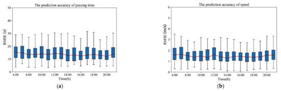 For the MFDL models, the temporal features of inputs are likely to be associated with the accuracy and stability of the prediction result, and we select the RMSE as the evaluation index. Figure 17 shows the RMSEs of the passing time and speed. The red curve means the fluctuation trend of the RMSE median, and the blue box pattern represents the error distribution of 92 entrance lanes in different periods. It can be seen that the RMSEs of the MDFL model fluctuate slightly throughout the day, indicating that the MFDL model has strong robustness. Moreover, the RMSEs fluctuate of the passing time rise slightly during the peak hour (i.e., 7:00–8:00, 17:00–18:00), whose median only increases by 2.4 of an entire day. Meanwhile, the RMSEs fluctuate in the speed prediction is also relatively low. In conclusion, the proposed model has high accuracy and fine stability under various temporal features.