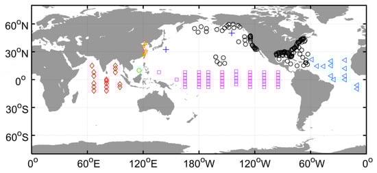 The locations of the 217 buoys used to evaluate the China-France Oceanography SATellite (CFOSAT) wind retrievals. Black circles, National Data Buoy Center (NDBC); pink squares, Tropical Atmosphere Ocean (TAO); red diamonds, Research Moored Array for African-Asian-Australian Monsoon Analysis and Prediction (RAMA); light blue left triangles, Pilot Research Moored Array (PIRATA); orange stars, the National Marine Data Center; green circle, the National Earth System Science Data Center; dark blue crosses, the Ocean Climate Station.