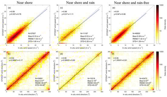 Scatter density plots of collocations for wind speeds (upper panels) and directions (lower panels) under all weather (a,b), rain (c,d) and rain-free (e,f) conditions in the near shore areas.