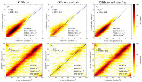 Scatter density plots of collocations for wind speeds (upper panels) and directions (lower panels) under all weather (a,b), rain (c,d) and rain-free (e,f) conditions in the offshore areas.