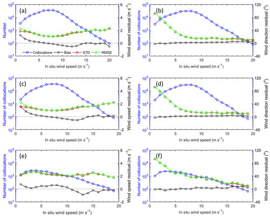 Residuals (CFOSAT—in situ measurements) of wind speeds and directions calculated in 1 m s−1 bins of in situ wind speed under all weather (a,b), rain-free (c,d) and rain conditions (e,f) in the offshore areas. Blue circles, black squares, red triangles and green diamonds represent the number of collocations, bias, STD and RMSE, respectively. Only bins involving more than 50 collocations are plotted.