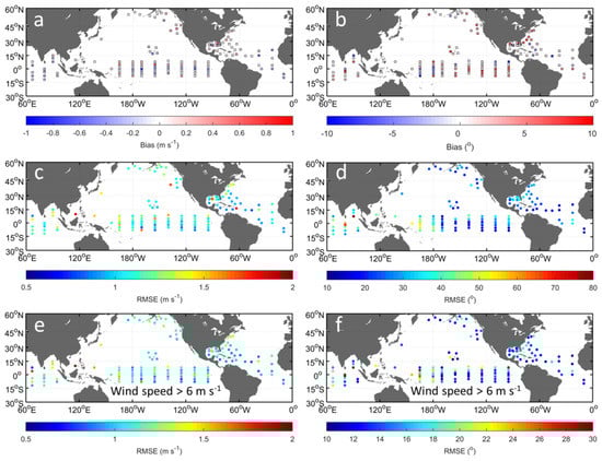 For the wind direction, most buoys showed a positive bias in the Pacific Ocean and the Indian Ocean except for a few stations with negative biases of 5° N–8° S, 165° E–180° W and 5° N–8° N, 95°–155° W (Figure 6b). The positive and negative biases were evenly distributed in the North Atlantic Ocean. The maximum bias was 9.96°, which is located at 2°S, 125°W. The corresponding minimum bias was –11.63°, which is located at 14.33°N, 46.08°W. It is clear that the RMSEs in the Atlantic Ocean and western tropical Pacific Ocean were smaller than those in the eastern tropical Pacific Ocean and Indian Ocean (Figure 6d). The maximum RMSE of 80.64° is located at 8° N, 90° E and the minimum RMSE of 11.43° is located at 8° S, 155° W. In addition, some large RMSEs > 50° occurred in the tropical Indian Ocean and western tropical Pacific Ocean. Similar to Figure 6e, the performance of wind direction RMSE significantly improved with the remove of wind speeds < 6 m s−1 (Figure 6f). Except for three buoys in the Pacific Ocean (2° S, 165° E; 5° N, 165° E; 0° N, 165° E) and four buoys in the Indian Ocean (8° N, 90° E; 8° N, 95° W, 1.5° S, 80.5° E; 0° N, 80.5° E), the RMSEs of the other buoys were less than 25°. One possible explanation is that there are some malfunctioning buoy instruments.
