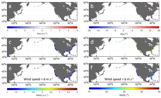 The wind direction bias is negligible on the US coast and is approximately 10° near the coast of China. Likewise, the RMSE of the wind direction near the coast of China (57.93°) is much larger than that near the coast of the US (33.36°). After wind speeds < 6 m s−1 were removed, the RMSEs near the coasts of China and the US decreased to 41.18° and 16.75°, respectively (Table 2).