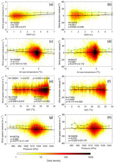 Scatter plots for wind speed and direction (wind speed higher than 6 m s−1) residuals with SWH (a,b), air-sea temperature difference (c,d), SST (e,f) and atmospheric pressure (g,h). Black squares, red triangles and green diamonds represent bias, STD and RMSE, respectively. The bold black lines indicate the least-squares linear regression. The star superscript indicates statistical significance at the 99% level.