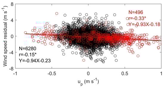 A small negative correction between wind speed residuals and up was obvious (Figure 9), indicating that the CFOSAT wind exceeds the in situ measurement under the condition of an opposite current. The r was −0.15, which is similar to that found by ASCAT, QuikSCAT and SCATSAT and less than that of European Remote Sensing Satellite (ERS) and AltiKa [,,]. Under high ocean current velocity conditions (>0.5 m s−1, red circles in Figure 9), the value of r was enhanced to −0.33, which indicates that surface currents have a great impact on wind retrieval over strong ocean currents. The slopes were −0.94 and −0.93. These values are similar to the slope observed by QuikSCAT [] and lower than the slope observed by AltiKa []. Due to the vertical shear between the Ekman currents and the geostrophic currents, the currents measured at 12 m and below are different from the ocean surface currents.