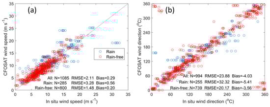To evaluate the performance of CFOSAT wind retrievals under the passage of TCs, half hourly TC track locations from the Cooperative Institute for Meteorological Satellite Studies (http://cimss.ssec.wisc.edu/, 1 March 2021) were used to obtain collocations. Simply assuming a TC affect radius of 303 km (global median value of TC radius where wind speed higher than 12 m s−1) and an affect time of 24 h [], 1085 collocations for the wind speed and 994 matchups for the wind direction were obtained with a spatial difference of 0.25° and a time difference of 30 min. All collocations were located in the offshore regions. Approximately 26% of them were under rainy conditions, which was approximately three times higher than the percentage of collocations offshore under all weather conditions (approximately 9%). The collocations resulted in a wind speed bias of 0.29 m s−1 and an RMSE of 2.11 m s−1 (Figure 10), which were much higher than those of −0.01 m s−1 and 1.32 m s−1, respectively, under all weather conditions in the offshore area (Figure 2 and Table 1). One may argue that the poor performance was most likely due to rain contamination during TC passage []. However, the bias (0.20 compared with −0.04 m s−1) and RMSE (1.48 compared with 1.16 m s−1) performances were also poor under rain-free conditions. Therefore, this might be due to the large RMSE at high wind speeds [,] and the reduction in the maximum wind speed due to spatial averaging []. For wind direction, the bias was small and the RMSE decreased from 23.88° under all weather conditions to 20.17° after rain was excluded (Figure 10). The good performance of wind direction may be attributed to the mean wind speed of 9.39 m s−1 during TC passage being much higher than that of 6.56 m s−1 under all weather conditions because the RMSE is very small at wind speeds > 7 m s−1 (Figure 5).
