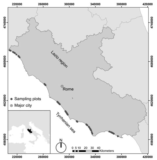 The study was carried out in a coastal tract representative of the Tyrrhenian dunes in central Italy (Lazio region, Figure 1). The sampled sector, approximately 70 km long, includes low sandy Holocenic dunes with Mediterranean climate [] disposed on a narrow strip along the seashore (<500 m) []. In natural conditions, plant communities on shifting dunes are dominated by few dune-building perennial rhizomatous grasses (e.g., Elymus farctus, Ammophila arenaria subsp. australis), which occasionally form monospecific vegetation patches. Plant communities on fixed dunes are characterized by small chamaephytes (e.g., Crucianella maritima) intermingled with species-rich therophytic grasslands (e.g., Cutandia maritima, Lagurus ovatus) [,]. As on most of the Mediterranean coasts, the analyzed dunes have undergone persistent human pressure that altered coastal landscapes and vegetation [,], with several sectors having been invaded by the iceplant (Carpobrotus spp.) [,]. Carpobrotus spp. is a perennial herb with succulent leaves that develops wide creeping mats []. It is native of South Africa and, along the Italian sand coasts, it preferentially invades herbaceous vegetation of shifting and fixed dunes [,,]. Field research evidenced that Carpobrotus spp. invasion substantially alters ecosystems diversity [,] and functioning of invaded areas [,], with such variations being also detectable by RS spectral values [,].