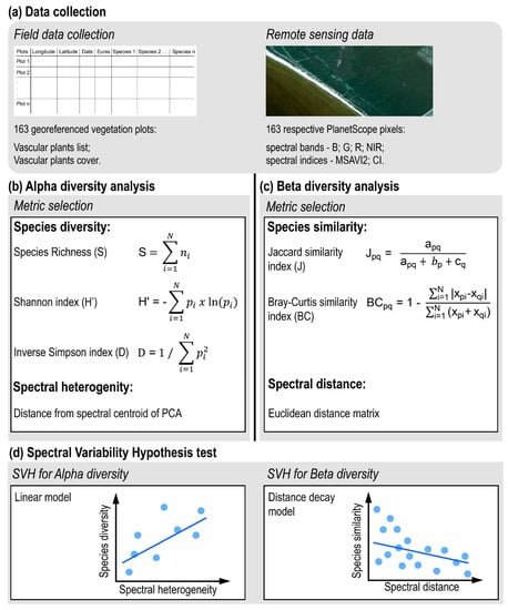 We tested the spectral variability hypothesis (SVH) for alpha and beta diversity in coastal dunes following a sequence of steps schematically reported in Figure 2: (1) Data setting, (2) Alpha diversity analysis, (3) Beta diversity analysis, (4) spectral variability hypothesis test.