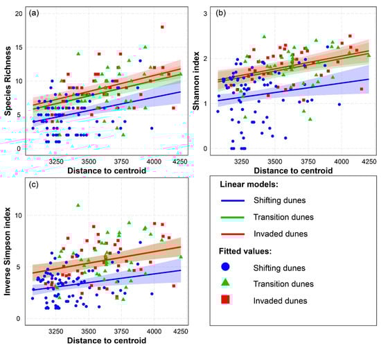 Linear regression models of alpha floristic diversity: species richness (a), Shannon (b) and inverse Simpson (c) vs. spectral heterogeneity: mean distance from spectral principal component analysis (PCA) centroid. Shifting dunes: N14 EUNIS category; Transition dunes: N16 EUNIS category: Invaded dunes: coastal dune vegetation with the presence Carpobrotus sp. covering more than 25 percent.