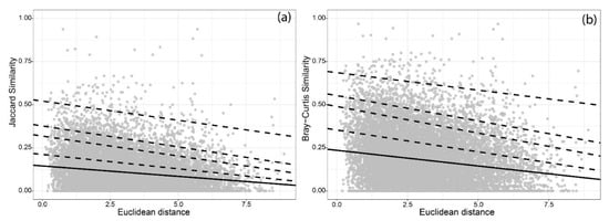 Distance decay models of Jaccard (a) and Bray–Curtis (b) species similarity versus spectral distance (spectral pairwise Euclidean distance). The linear regression is described by solid line, the quantile regressions considering four different τ (from upper to lower lines: 0.99, 0.95, 0.90, 0.75) are reported by dashed lines. Gray dots represent the sampling plots.