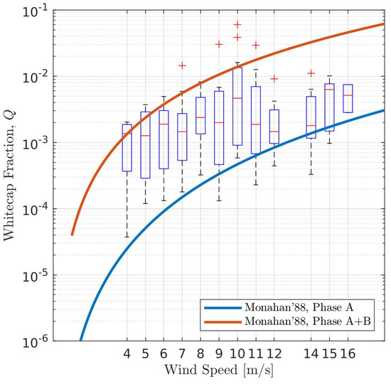 Whisker plot of whitecap fraction, Q, versus wind speed from the processing step (i) of all video data. The range of each box shows the 25th and 75th percentiles of each wind sample. Red strokes are sample medians, dashed lines (whiskers) are observation spread. Red crosses are outliers distant the interquartile range from box bounds. The solid lines are empirical laws [47].