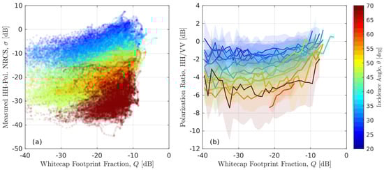 (a) Observed normalized radar cross-section (NRCS) and (b) bin-averaged polarization ratio, , versus whitecap footprint fraction, Q, for various (color-coded) incidence angles, .