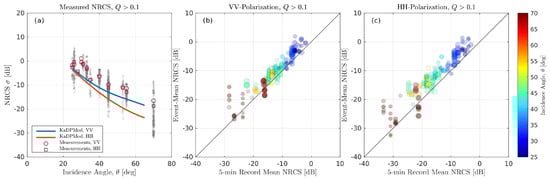 (a) Observed NRCS measured at footprint fractions, , versus incidence angle, . Lines show the empirical KaDPMod [43] background NRCS. Gray shades show the HH-polarization NRCS points spread, with artificial noise in for better visualization. Model data are shown for the most frequent observation conditions: upwave, 10 ms wind speed. Scatterplots of event mean and 5-min. mean NRCS for (b) VV and (c) HH polarization for various (color-coded) incidence angles, . Symbol size is proportional to wind speed. Symbol transparency is proportional to whitecap footprint fraction, Q.