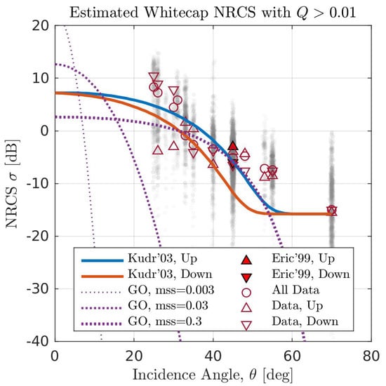 Estimated whitecap NRCS, , versus incidence angle, . Gray shades show the spread of observed at HH-polarization (some spread is artificially added to observed for better visualization). Filled red triangles show Ericson et al. (Eric’99) [35] laboratory breaker NRCS measurements. Dashed lines show the Geometric Optics (GO) for various mean-square slopes (mss). Solid lines show the Kudryavtsev et al. (Kudr’03) [10] breaker NRCS parameterization.