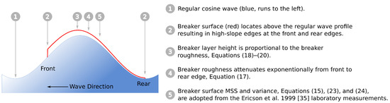 Because these breaker-induced disturbances are produced by a water mass separating from the breaking crest, their mean level is non-zero. They originate on the forward slope of breaking wave and gradually dissipate, expanding on the rear slope. To provide a realistic and consistent description of breaking wave parameters, an empirical breaking crest isotropic roughness spectrum that was suggested in [35] is adopted: