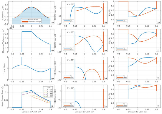 Simplified breaker model. Left column: (a) a sketch of breaking wave profile, (d) standard deviation of breaker-induced surface elevation, (g) local normal angle, (j) mean-square slope of breaker-induced roughness. Middle column: up and downwave breaker NRCS for various incidence angles, (b) , (e) , (h) , (k) . Right column: up and downwave breaker effective Fresnel coefficient normalized by the nominal Fresnel coefficient, , for various incidence angles, (c) , (f) , (i) , (l) .
