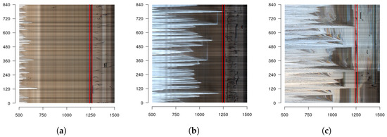Figure 1. The three categories of storm impact regimes estimates from timestack images. y-axis represents the time in seconds, x-axis represent the pixel index (cropped images), and red lines represent the sea wall bottom and top positions. (a) Swash regime. (b) Collision regime. (c) Overwash regime.