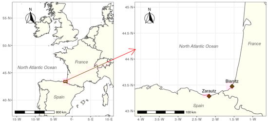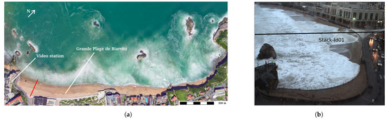 The Grande Plage of Biarritz (GPB) is an urban embayed beach that is 1.2 km long, located on the southern Aquitanian coast of France (Figure 2). It has a high socio-economic importance for the city of Biarritz due to its tourist appeal, its historical heritage, and its location near the city center. In terms of characteristics, the GPB is an intermediate-reflective beach with typically a steep foreshore slope of 8–9% and a gentle nearshore slope of 2–3% [30]. It is a mesotidal beach with 4.5 m spring tidal range around a mean water level of 2.64 m. This narrow beach is backed by a seawall with an alongshore elevation varying between 7 and 8 m. This seawall serves as defense infrastructure for back beach buildings.