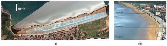 Figure 4. (a) Satellite view of the site of Zarautz from Google Earth, with the red point representing the location of the video monitoring station. (b) Positions of the transects on the site of Zarautz.