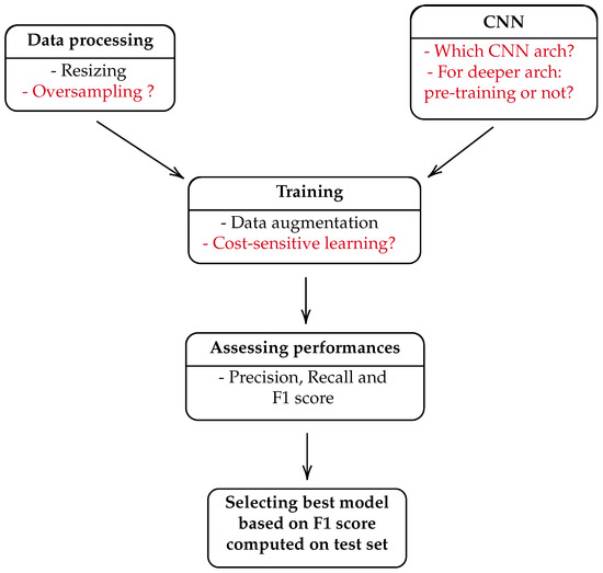 The workflow for this study is presented in Figure 5. For each site, the four CNNs with different architectures were fitted without and with the two methods related to the class imbalance problem: oversampling and cost-sensitive learning (class weights). Transfer learning was used on the more complex architectures (VGG16, Inceptionv3) and only for the best performing method to cope with class imbalance. Data augmentation was used during the training of all the CNNs.