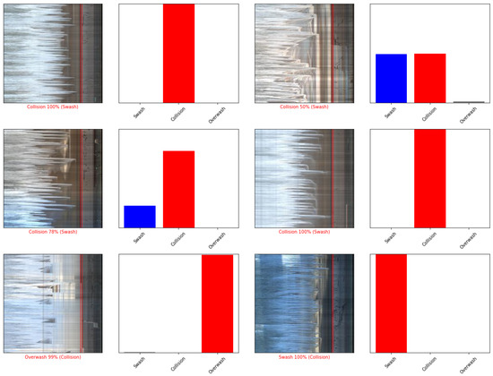 Figure 6. Prediction errors on the test set of Biarritz by the best CNN. The storm impact regime predicted is written under each timestack, and the ground truth is written in parentheses. The probabilities of belonging predicted by the CNN are represented on the right side of each timestack (red = prediction made by CNN, blue = ground truth). The red line in the timestack represents the position of the seawall.