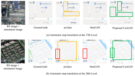 Generated results at multiple levels using different models. (a) Automatic map translation at the 17th Level. From left to right: RS image + annotation image, Ground truth, by pix2pix, by StarGAN and by the proposed CscGAN. (b) Automatic map translation at the 18th Level. From left to right: RS image + annotation image, Ground truth by pix2pix, by StarGAN and by the proposed CscGAN. Note: in generated mappings, red rectangles represent loss contents; yellow rectangles represent confused contents; green rectangles represent the correct contents generated by the proposed method.