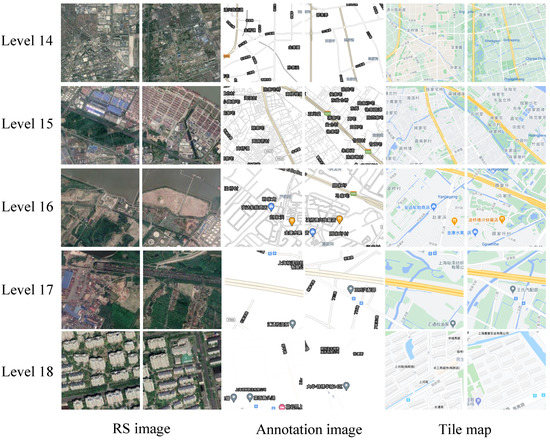 This dataset was collected, annotated and built independently by the authors. The pairs of RS images, annotation images and maps with multiple levels scraped from Google Maps. The RS image, annotation image and the corresponding map for this dataset were collected from some regions in Shanghai and Hubei, China, covering 14, 15, 16, 17 and 18 levels, respectively. In this dataset, there are 1476 pairs of tile images (namely maps and RS images) at each level, where the size of each tile is 256 × 256 pixels. Figure 3 shows examples with different levels from the dataset, and Table 2 lists the detailed information of the dataset.