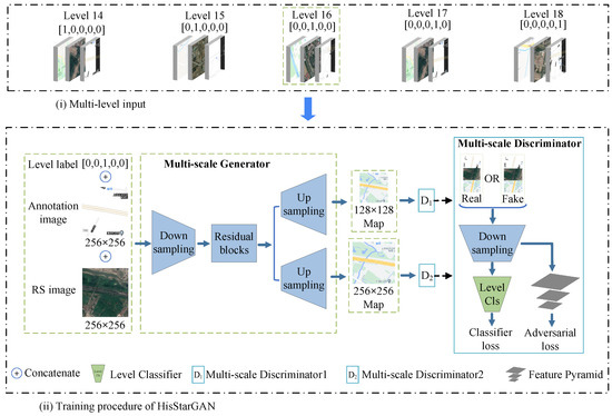 In this section, a map-level classifier is introduced to guide the network for discriminating the learned representations from which level. To make use of the prior conditions, the map-level classifier M is plunged into the top of the multi-scale discriminator D, as shown in Figure 7, improving the stability and efficiency of adversarial training for map generation at different levels.