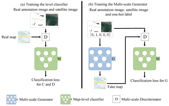 The training procedure of the map-level classifier. G represents the multi-scale generator, M represents the map-level classifier, and D represents the multi-scale discriminator. (a) The real image goes through D and then into M to calculate the classification loss and optimize the classifier and the multi-scale discriminator . (b) G generates a map based on the input RS image, annotation image and level label. Then, M calculates the classification loss of the generator and optimizes the multi-scale generator.