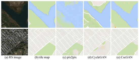 The proposed CscGAN was compared with existing state-of-the-art methods, including pix2pix [2] and CycleGAN [30] on the maps dataset, as shown in Table 3. The pix2pix uses an RS image x to realize the translation from the RS image x to the tile map y. CycleGAN also achieves translation from the RS image x to tile map y, but the data requirements are not as strict as pix2pix. The PSNR [31], SSIM [31,32], and pixel accuracy [4] mentioned in Section 5.1 were used to evaluate these methods. Table 3 lists the experimental results, and Figure 8 shows the visualization results generated by the different methods on the maps dataset. Compared to the state-of-the-art methods, the proposed CscGAN achieved outperformance in all evaluation metrics.
