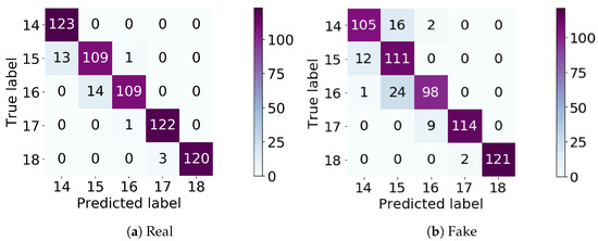 The classification results by the level classifier. (a) The confusion matrix of classification on the real data; (b) the confusion matrix of classification on the fake data.