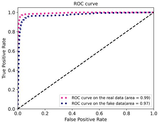 To further study the effectiveness of the level classifier, Figure 10 and Figure 11 respectively provide the confusion matrixes and ROC curve of real-fake map classification in the level classifier on the self-annotation RS-image-to-map dataset. From Figure 10a, we can be observed that the map-level classifier reached an accuracy of 94.8%, precision of 94.97%, recall of 94.8%, and F1 score of 0.95 for real map classification. Additionally, we used the multi-scale generator to generate a fake map as the input into the level classifier. The classified results by the level classifier are shown in Figure 10b. Most of the fake maps can be successfully classified to the corresponding level by the level classifier (the accuracy is 89.27%, the precision is 90.14%, recall is 89.27%, and F1 score is 0.89). Moreover, Figure 12a,b respectively presents the generated maps at the 17th, 18th level, whether using the level classifier. Obviously, the level classifier makes the generated map details richer and more accurate.