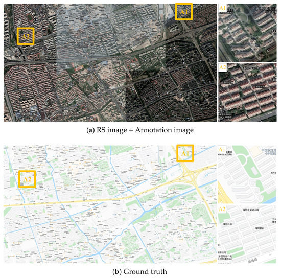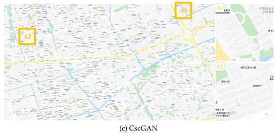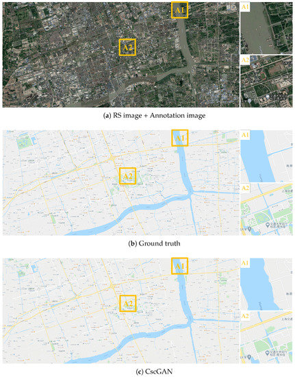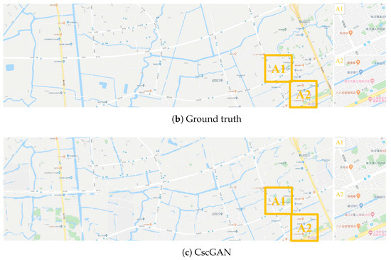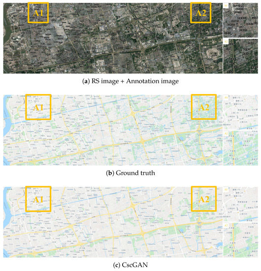 Figure 13 presents the large RS image, annotation image, ground truth, and generated map in Songjiang District of Shanghai at the 14th level, where the results generated by the proposed CscGAN are very similar to the RS image and the ground truth. The generated results in Figure 13c show that both the coarse information including green land, rivers, and some rough roads and the detailed information including map annotations and words, are similar to the ground truth. For clarity, the zoomed local areas (A1 and A2) are on the right of the figure. Note that, because there is slight mismatch between RS images and real maps (see Figure 13a,b), the low resolution images at the 14th level are difficult to distinguish the fake or real features by the discriminator.