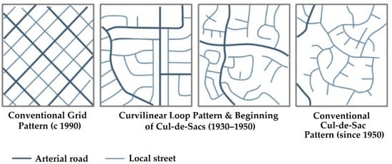 UHIs can be exacerbated by the inappropriate design of the urban fabric, inappropriate building and surface materials, a lack of vegetation, and designed urban activities [,,,,,]. As a result, UHIs have been a central theme among climatologists, planners, and urbanists and are well documented in several metropolitan areas worldwide [,,,,,,,,]. Two factors related to the urban fabric significantly affect the UHI; these are the urban morphology and the urban geometry. Urban morphology refers to the study of the urban form that focuses on the formation and transformation of urban structures of cities over time; their spatial patterns at different scales; and physical characteristics to inform appropriate urban interventions []. There are several street styles (Figure 1); the most common styles are the conventional grid “Gridiron”, curvilinear loop pattern, and conventional cul-de-sac patterns [].