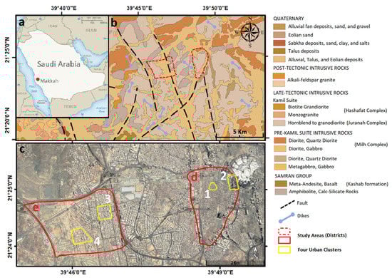 (A) The location of Makkah city; (B) geological map showing the distribution of rocks units in Makkah. Reprinted from ref. []; (C) locations of the four clusters inside the two selected districts (D—AlSharashef; E—AlEskan).