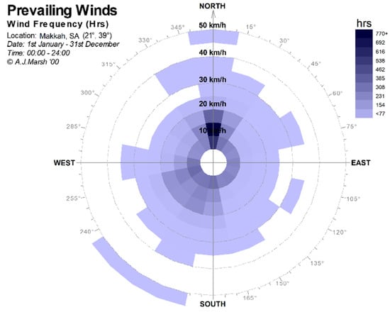 Analyzing the speeds, directions, and frequencies of wind in Makkah revealed that the direction of the prevailing wind is north with the highest frequency and speed in Makkah, reaching 15 Km/h. A high speed and frequency of wind also come from the southwest, reaching 6 km/h (Figure 3).