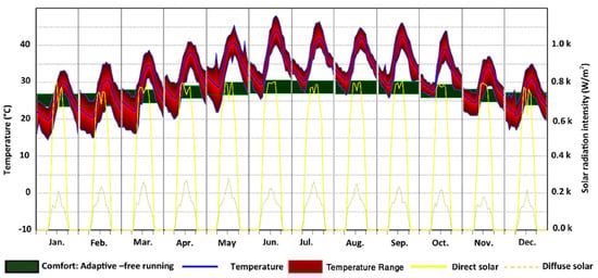 Analysis of the diurnal hourly average air temperature (Figure 4), which employed the comfort: thermal neutrality model, showed that the thermal comfort zone in Makkah city ranges between 18 and 31 °C. The Weather Tool, which incorporates Humphreys’ adaptive algorithms [], enables the consideration of adaptive actions taken by building occupants. Additionally, the analysis showed that most of the annual air temperature values lie outside the comfort zone, with a maximum of 48 °C in June, a minimum of 14 °C in January, and an average air temperature of 31 °C (Figure 4).