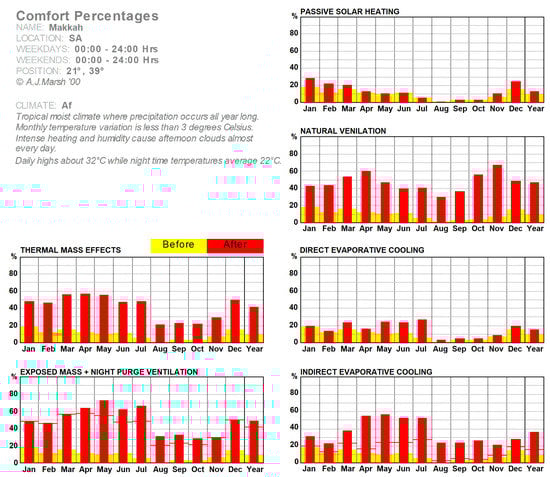 Comfort percentages using different passive strategies in Makkah, from the Weather Tool.