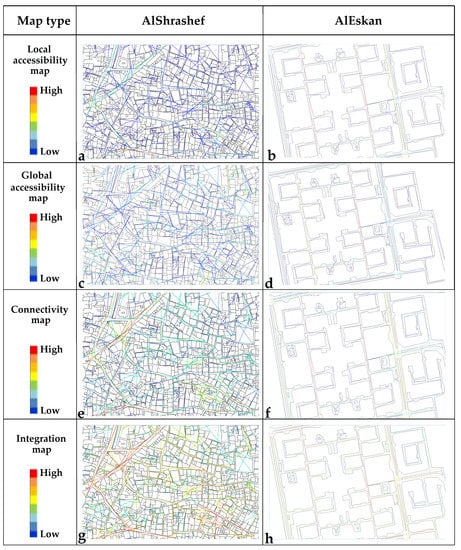 The spatial characteristics of the street network were obtained in the digital CAD file format from the Prince Khalid Al-Faisal Chair for Developing Makkah Al-Mukarramah and the Holy Places at Umm Al-Qura University [] and were analyzed using the Space Syntax software. The analysis of the urban characteristics of the different clusters in the two districts show that the axial lines have different levels (red, orange, yellow, green, blue, and indigo): red lines have the highest value, while orange lines have a middle value, and the indigo lines have the lowest value. The dark red and orange lines in AlSharashef and AlEskan are highly accessible, integrated, and connected areas. The green and blue axes are the less accessible, integrated, and connected spatial structure areas. A high value of integration indicates that the street accessibility of these parts for pedestrians is more than that of other segments. Blue and indigo segments are the most segregated parts—they are not integrated into the entire city street network. Segregated vs. integrated indicates two contrasting types of spatial layouts; the former indicates that all spaces are far away from all the others, and the latter indicates that all spaces are close to all the others [,]. On analyzing the values statistically, it was found that the AlSharashef cluster shows higher values than the AlEskan cluster in terms of local accessibility, connectivity, and integration. In comparison, it provided lower values in terms of global accessibility (Figure 6). It is obvious from the maps that few straight linear streets in the AlEskan district have higher values in terms of accessibility, connectivity, and integration, while the rest of the streets have lower values, which indicates more segregation of spaces. This indicates that the internal integration of the organic fabric with a conventional cul-de-sac pattern is higher than that of the deformed iron-grid urban fabric with a curvilinear loop pattern, which has been proved in previous studies [,,,,,,,]. It is worth mentioning here that the high value of connectivity and integrations allows more shade and shadow, enhancing walkability levels and creating differential pressure. The latter, in turn, forces the air to move [,,]. This proves the efficiency of the organic urban fabrics in hot arid zones in terms of thermal performance and urban efficiency.