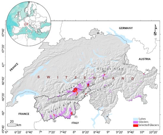 Overview maps of the research study area and the glaciers with mass balance measurements analyzed in this work (source: ESRI, USGS, NOAA, and DHM25/200). The map represents: (a) Silvretta (b) Clariden (c) Rhone (d) Gries (e) Grosser Altesch (f) Hohlaub, Allalin, Schwarzberg (g) Gietro.