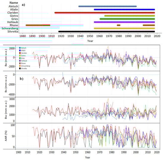 These mass balance time series are calculated by glaciological field methods including dense snow probings and pits dug in April–May that measured the winter snow accumulation, and ablation stake readings in September []. The longest mass balance time series (since 1900) for 50 glaciers in the Swiss Alps was reconstructed by Huss et al. [] based on the combination of field measurements and ice volume changes by comparison of DEMs. The extrapolation of individual measurements to the entire glacier surface was performed using a mass balance model which considers all important processes controlling glacier mass balance distribution. There are seven glaciers in the Upper Rhone catchment with a long sequence of mass balance measurements recorded since 1884. In this dataset, winter mass balance (Bw), corresponds to the accumulated snow/ice mass measured from October to the end of April. Summer mass balance (Bs) is the result of difference between annual mass balance (Ba) determined at the end of the ablation period (end of September) and Bw. The length of annual mass balance and time series of Ba, Bw, Bs, and AAR for each glacier are presented in Table 1 and Figure 2a,b.
