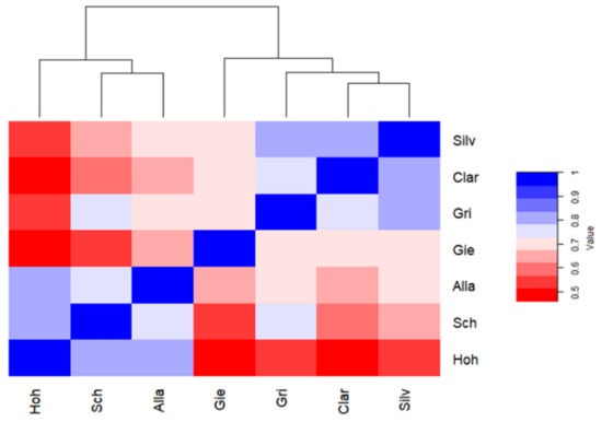 A heatmap representation of the Spearman correlation matrix of detrended Ba and dendrogram of similar groups of glaciers (group 1: Silvretta (Silv.), Clariden (Clar.), Gries (Gri.) and Gietro (Gie.); group 2: Allalin (Alla.), Schwarzberg (Sch.) and Hohlaub (Hoh.)). The right bar shows the color code of the correlation coefficients (all significant at p < 0.01).