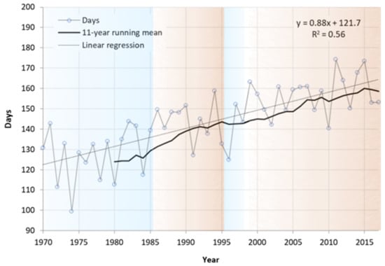 The overall analysis of days with the maximum temperature > 0 °C per year for all selected glaciers indicates that the total number of days has considerably increased from 130 days in 1970 to 175 in 2015 with a change rate of ~9 days per decade (Figure 4).
