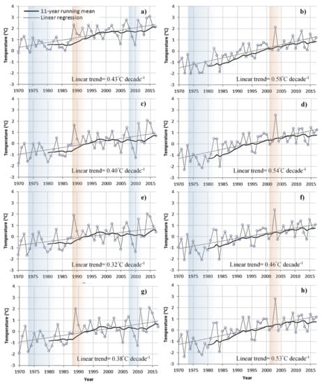 The strongest summer warming trends were during the period of 1970 to 2017 (Figure 5b,d,f,h). The largest trends were found for glaciers located in the southern Rhone including Gietro, Hohlaub, Allalin, and Schwarzberg (0.58 °C decade−1) (Figure 5b), and the smallest trend was found for for Silvretta (0.46 °C decade−1) (Figure 5f). Following the same pattern of the Italian Alps [], three discernible phases can be detected from a 11-year running mean applied to the time series. The first phase starts from 1970 with the mean air temperature anomalies around −1 °C. Then, after 1985, the anomalies reached 0 °C and remained stable until 2000s. Since the 2000s, air temperature anomalies over glaciers have been accelerating beyond 0 °C and have approached +1 °C in recent years with the unprecedented peak of roughly +3 °C for all glaciers in 2003.