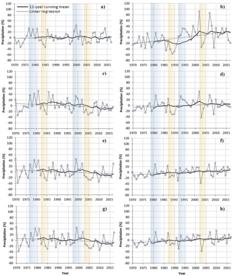 The total precipitation anomalies do not reveal significant trends in accumulation season (Figure 6a,c,e,g). The moving averages of precipitation have fluctuated close to the long-term mean. However, for the northern Rhone glaciers (Figure 6c), Silvretta (Figure 6e), and Clariden (Figure 6g), two phases are apparent. In the first phase, periods with above-average precipitation were frequent prior to the second half of the 2000s, with the maximum of ≈40% and the minimum of ≈−40% in 1985 and 2005 and the maximum of 50% at the beginning of the 1980s. In the second phase, running average precipitation remained steady prior to 2010 and was then followed by a ≈10% drop below the long-term mean after 2010.