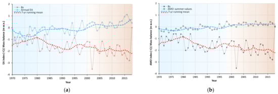 The analysis of Bs and Bw suggests that the changes in mass balance are primarily influenced by increases in ablation rates during summer (Table 4), which agrees with previous studies [,].