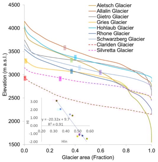 For hypsometric analysis, we use swissALTI3D DEM obtained from the Swiss Federal Office of Topography (Swisstopo) for the seven glaciers in the catchment and the newly released ASTER GDEM Version 3 (V3) data for the two additional glaciers located in the Central and Glarus Alps. This swissALTI3D DEM (2019 edition) represents the surface glaciers at a spatial resolution of 10 m with ±1 m to 3 m (1σ) vertical accuracy for the stereo correlation and ±0.1 m to 1 m for manual stereo measurements. Areas below 2000 m a.s.l. were created using airborne laser scanning data with an accuracy of ±0.5 m (1σ) []. The ASTER GDEM V3 was released in 2019 and displays similar level of accuracy as ASTER GDEM V2. However, V3 has lesser void area due to the increase in ASTER stereo image data since the previous release and improved processing [].