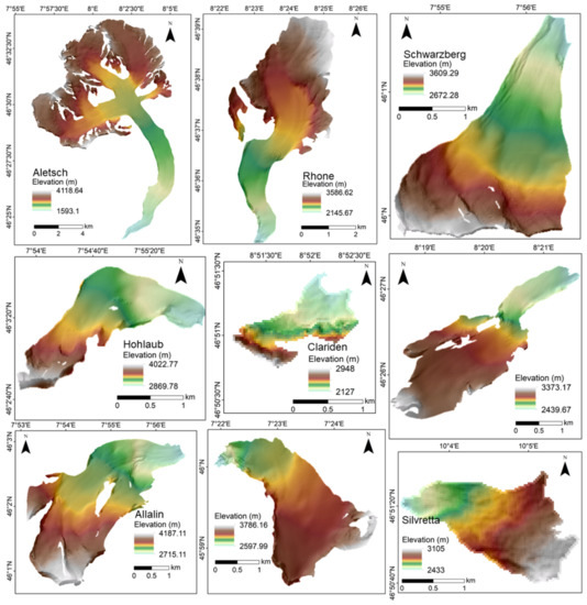 This study is focused on seven glaciers (Grosser Aletschgletscher, Allalin, Hohlaub, Schwarzberg, Gries, Gietro, and Rhone) of varying size, geometry, hypsometry, aspect, and slope, in the Upper Rhone catchment (Figure 1 and Table 1). Grosser Aletschgletscher, which is located within the Bernese Alps, is the longest (22.6 km) and largest (83.0 km2) ice body in the European Alps, with an extensive archive of climate data and glaciological records dating back to 1841 [,]. The accumulation area of this glacier faces south and contains two summits, Jungfrau and Mönch. The main body is divided by three branches (Grosser Aletschfirn, Jungfraufirn, and Ewig Schneefeld) at Konkordiaplatz with reported ice thickness of 890 m at its summit. According to the reports, it has lost significant volume since the Little Ice Age with a fast acceleration since the late 1980s [].